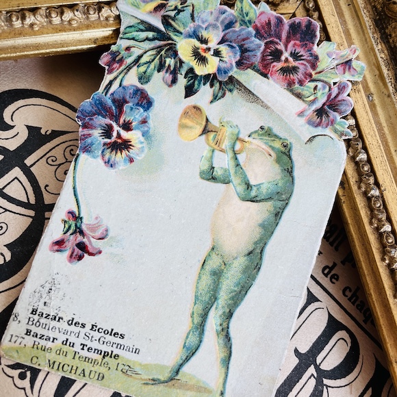 フランスアンティーク クロモス・クロモカード カエルの音楽家 KaMiMoNo2フランスのアンティークカードショップで出合いました。老舗チョコレート屋さんショコラプーランChocolatPoulainのクロモス・クロモカードです。roseantique.cart.fc2.com