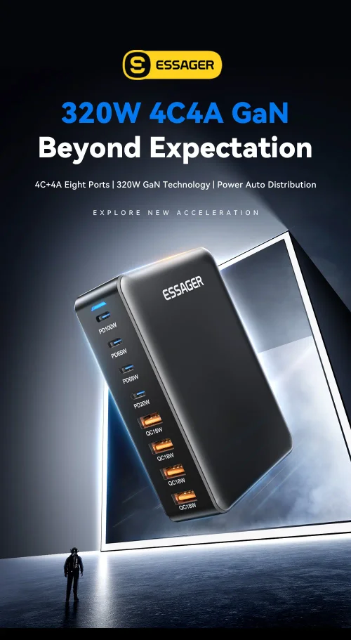 デスク周りのケーブルのごちゃつきに悩んでいたところ、出会ったのが「Essager 320W GaN充電器 8ポート USB Type-C デスクトップ充電ステーション PD 100W 高速充電 (iPhone 17, 16, 15, iPad, MacBookノートパソコン用)」です。これ一つで複数のデバイスを同時に、しかも急速充電できるという点に惹かれ、思い切って購入してみました。