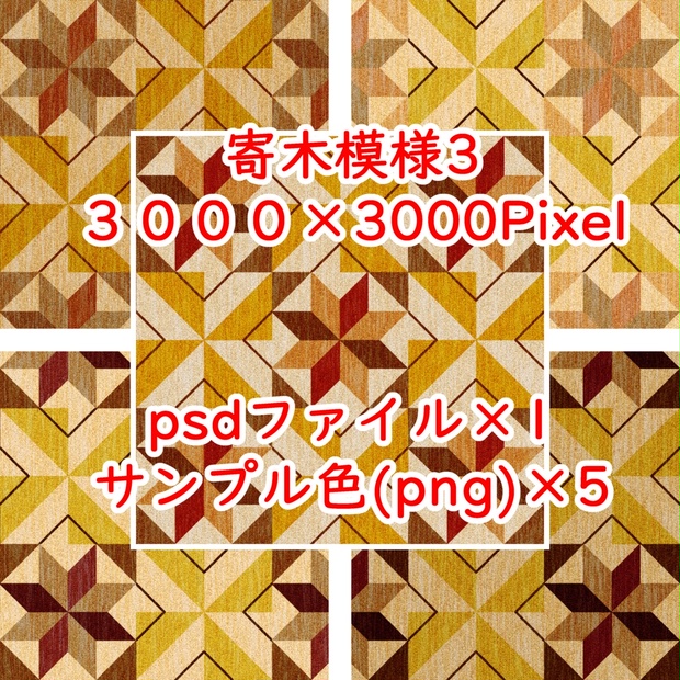 寄木模様3 - KABA(旧 翁木とも)グッズ販売 - BOOTH3000×3000pxの正方形の素材です。 CLIPSTUDIOで制作し、psdファイルで保存しました。 psdファイルで色ごとにレイヤー分けがされていますので、自由に色が変更できて便利に使えると思います。 この素材で少しでも作品制作の手間が減れば幸いです^^ サンプル色として5色の画像ファイル(png)もついています。 利用規約 ・ここで配布している素材は…ohkitomo.booth.pm