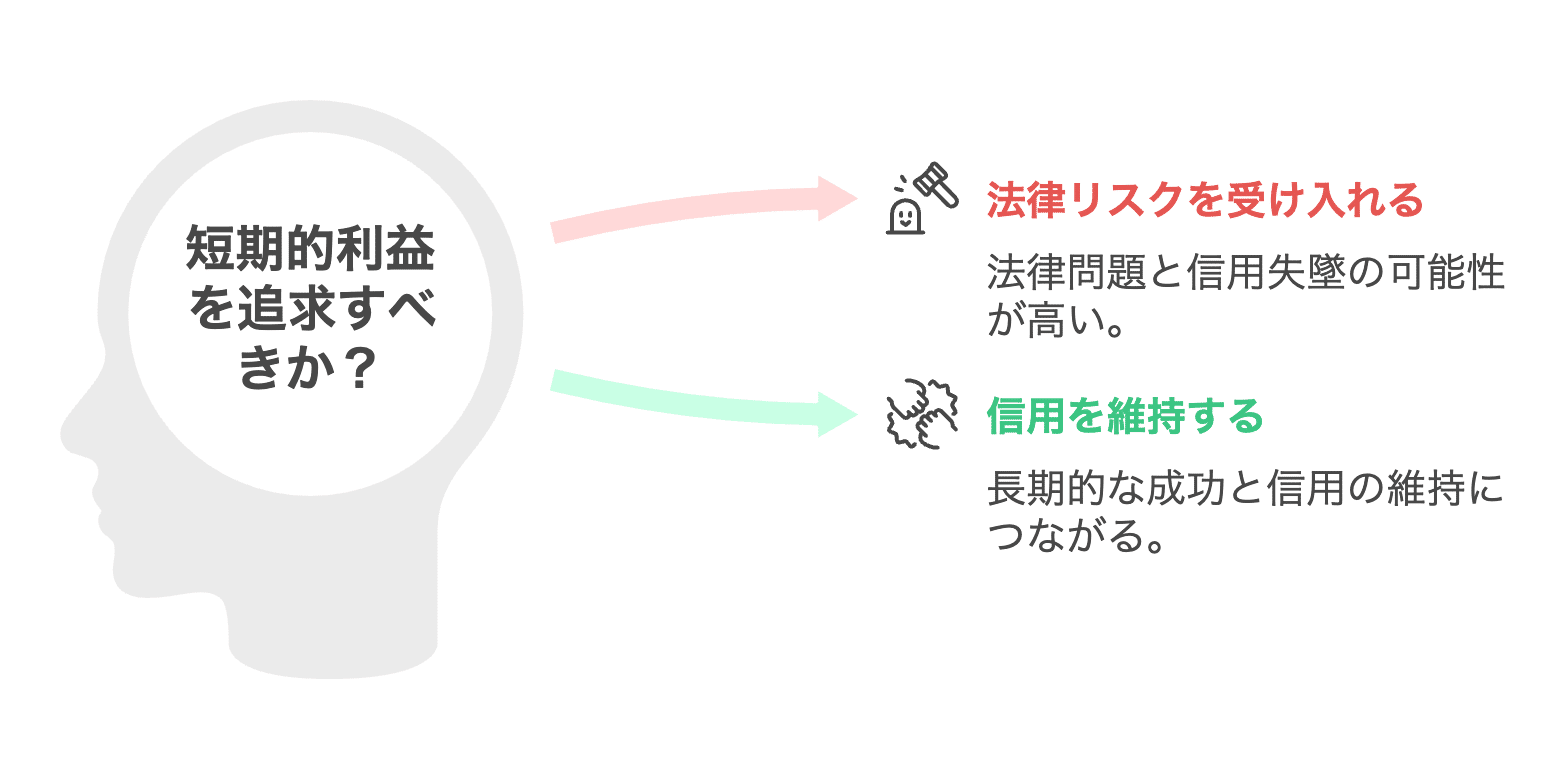 短期的に利益を上げるために、過度なセールストークや誤解を招く広告をしてしまうと、法律的なリスクだけでなく、一度失った信用を取り戻すのは非常に困難です。