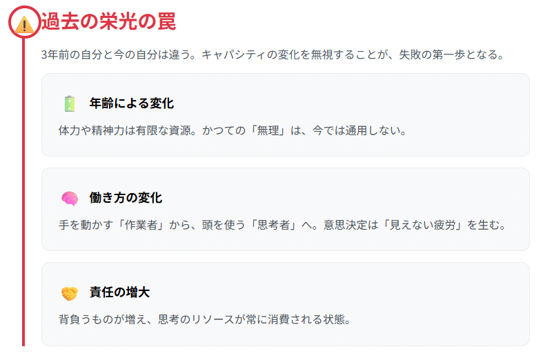 それは単なる体力の低下というよりも、精神的な粘り強さを含めた、人間というバッテリーそのものが経年劣化していくという、避けられない現実なのです。