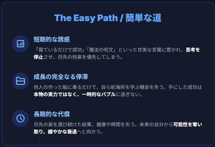 その安易な選択こそが、あなたの人生を緩やかに、しかし確実に停滞させ、終わらせてしまう毒であるということを。
