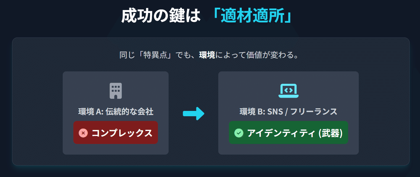 自分の特性が「コンプレックス」になる場所で戦い続けるのか、それとも「アイデンティティ」として輝ける場所を自ら選ぶのか。