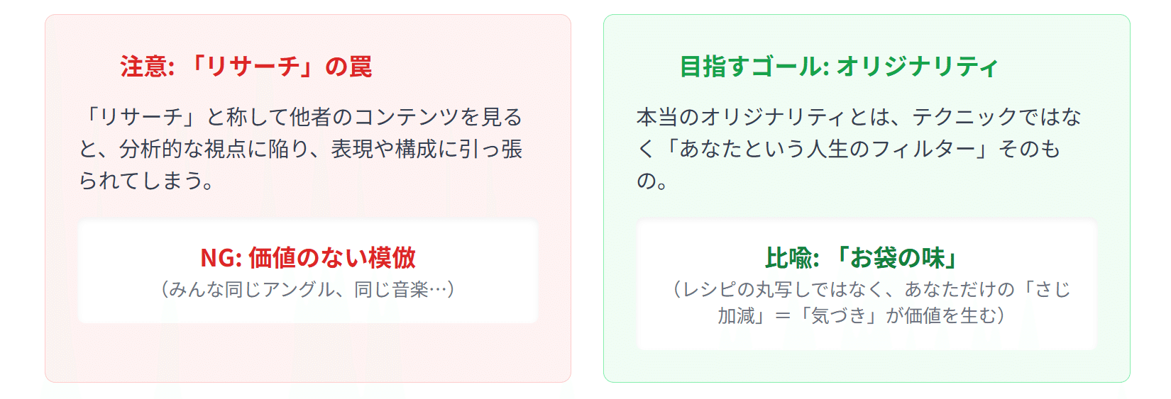 しかし、それはあくまで「リサーチ」としてではなく、自分のオリジナリティを表現するための「手段」として学ぶ姿勢が重要です。
