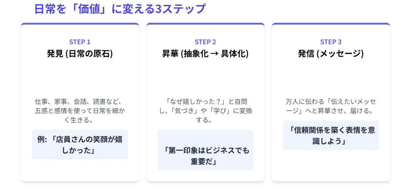 時には比喩表現を用いながら、日常に起きたことへの「気づき」や「学び」を、一つの「伝えたいメッセージ」へと昇華させていく。