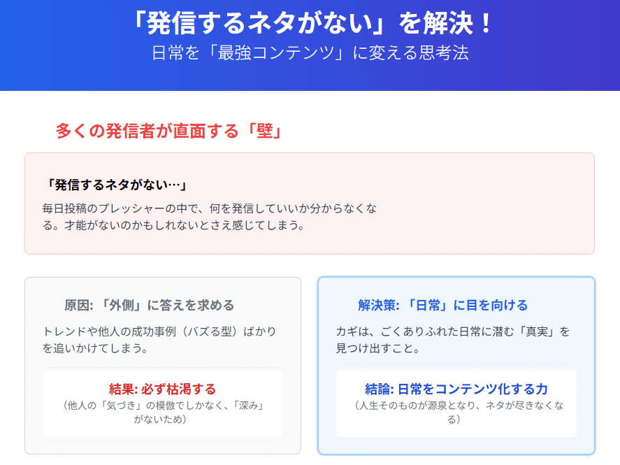 この記事では、なぜ多くの人がネタ切れに陥るのか、そしてどうすれば「日常」という無限の宝庫からコンテンツを生み出し続けられるのか、その核心的な能力について徹底的に深掘りしていきます。
