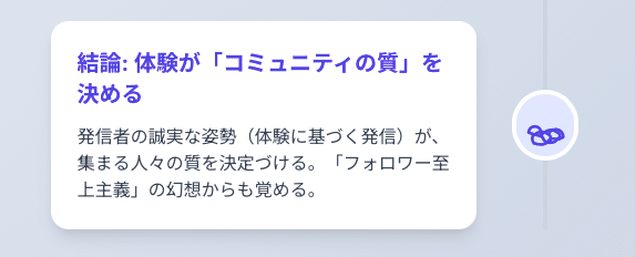 このように、発信者自身の消費者体験に基づいた誠実な姿勢は、結果として集まってくる人々の質、つまりコミュニティの環境を決定づけます。