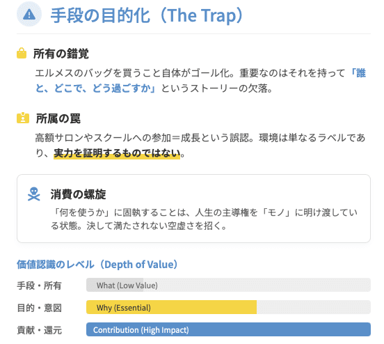 しかし、そのバッグを持つことがゴールになってしまっている状態は、非常に危険であり、ある種の空虚さを孕んでいます。
