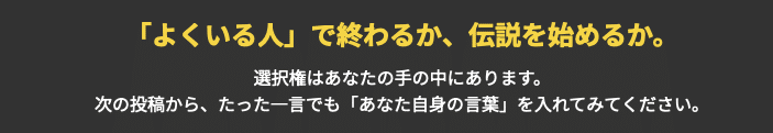 しかし、泥臭く、カッコ悪く、震えながらも土俵に上がり続けるプレイヤーだけが、本当の意味での果実を手にすることができるのです。