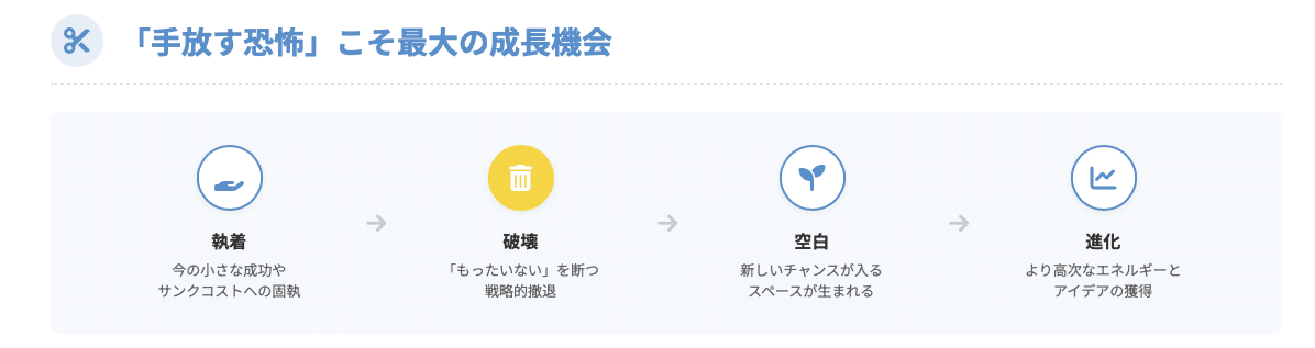「サンクコスト(埋没費用)」への執着を断ち切り、積み上げたものを破壊する勇気を持たなければなりません。