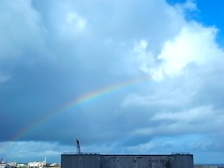 昨日その朝礼中、安謝の港方面に虹がかかりました。