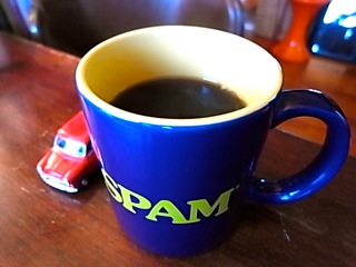 本日の珈琲はいつものブレンドを「SPAM」のマグカップ with Mini Cooperで。