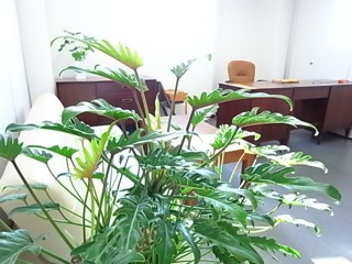 ドアを開けると、キャビネットの上の観葉植物がお出迎え。