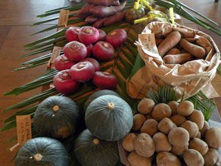自然栽培で育てたかぼちゃや人参、じゃがいもやお米などの野菜や穀物、