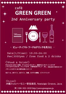 北中城のcafe GREEN GREEN、2周年のパーティーのお知らせです。