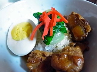 県債地鶏ととろとろ軟骨ソーキの中華丼です。紅ショウガがチャーミング(笑)。