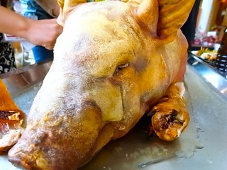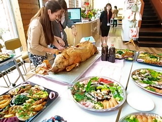 子豚くんの丸焼きさんがパーティーテーブルの上で甲羅干し。