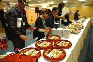 サラダ、お寿司、お肉料理、フルーツなどのビュッフェスタイルでした。