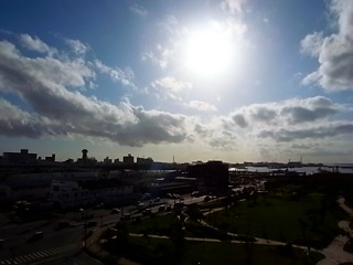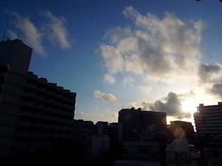 午前6時40分頃。オレンジ色に染まる那覇の街。