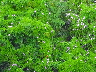 写真はベランダから撮影したお隣さんの朝顔の垣根。