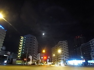 今朝3時頃の街の灯りとビルの谷間に浮かぶお月様。