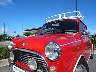赤と白と青と緑のコントラスト。ミニクーパーもご機嫌です。