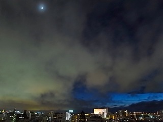 昨晩の夜景。ハーフムーンと低い雲と湿度の高い風の競演。