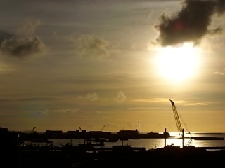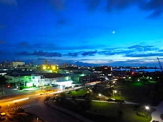 日の出の時刻になると、雲は流され那覇の街を朝緋色に染めます。