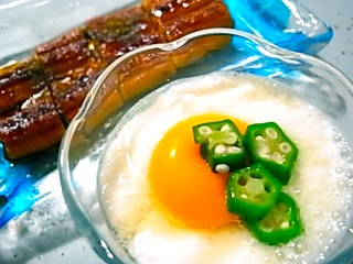 山芋とろろとオクラと地鶏の卵をトピングで。最強です(笑)。