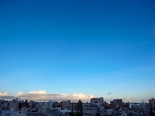 南国の真夏の夜明けでございます。青空が澄んでいます。