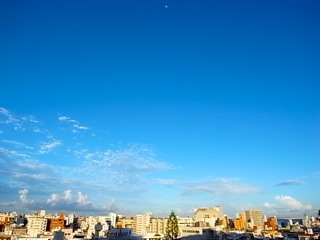 朝日に染まる那覇の街。朝日とお月様の競演です。