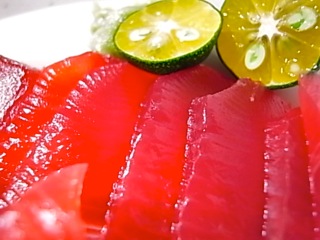 自宅で鰹の刺身withシークワァーサーで晩酌を。