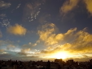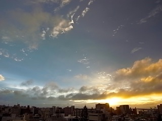 雲が凄い勢いで西北西に流され夕陽が射します。