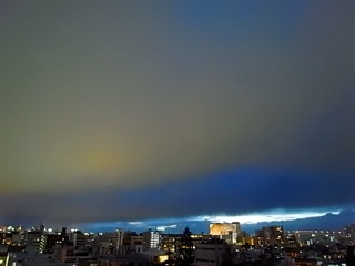 ブルー&グリーンメタリックな空の色彩。台風独特の空。