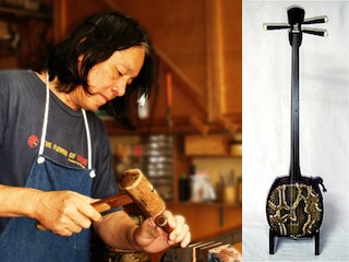 自身は三線づくりの名人として知られる照屋林次郎さんの新作三線を、