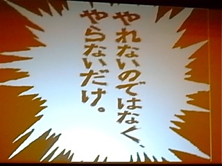 安藤竜二(株式会社DDR)の基調講演。写真は、とどめのメッセージ。