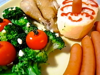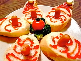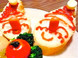 フランスパンにサンタの顔を描き、お鼻のウィンナーは