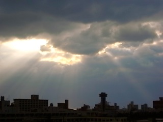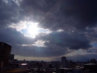 今日の沖縄の空。ちょうど雲の合間から太陽が顔を出したところ。
