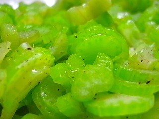 トッピングに、セロリのアリーブオイル炒め。大人は鷹の爪も。