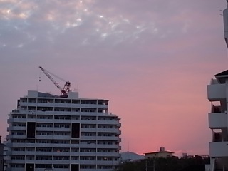 淡い桃色と淡い青のコントラスト。ステキな朝焼け。