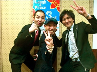 写真は、カレッジ学院長の坂内氏、スリムクラブ、沖縄担当下地氏。
