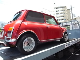 トラックで運ばれるミニクーパの図。ドナドナな気持ちです(笑)。