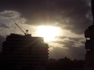 西の空は朝日を受けて雲や街が輝きます。