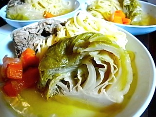 キャベツ丸ごと煮込みスープパスタ温野菜添えを。