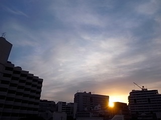 ビルの谷間からのご来光。シャキっと背筋が伸びます。
