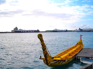 出廷を静かに待つ爬竜船(はりゅうせん)で。