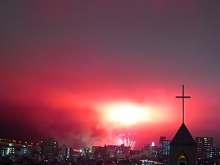 低い雲と花火の煙に反射して幻想的な風景を生み出します。