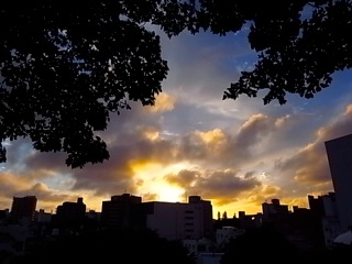 ガジュマルの木、那覇の街、そして夕焼け。