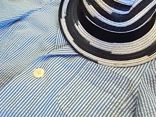 新調したパナマ帽とラルフのマリンストライプのサマージャケットで。