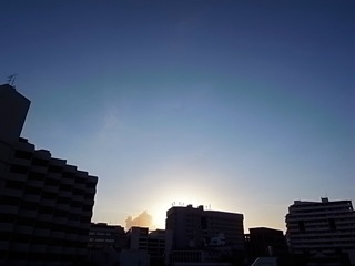 朝日が当たる那覇の街、オレンジ色に染まります。